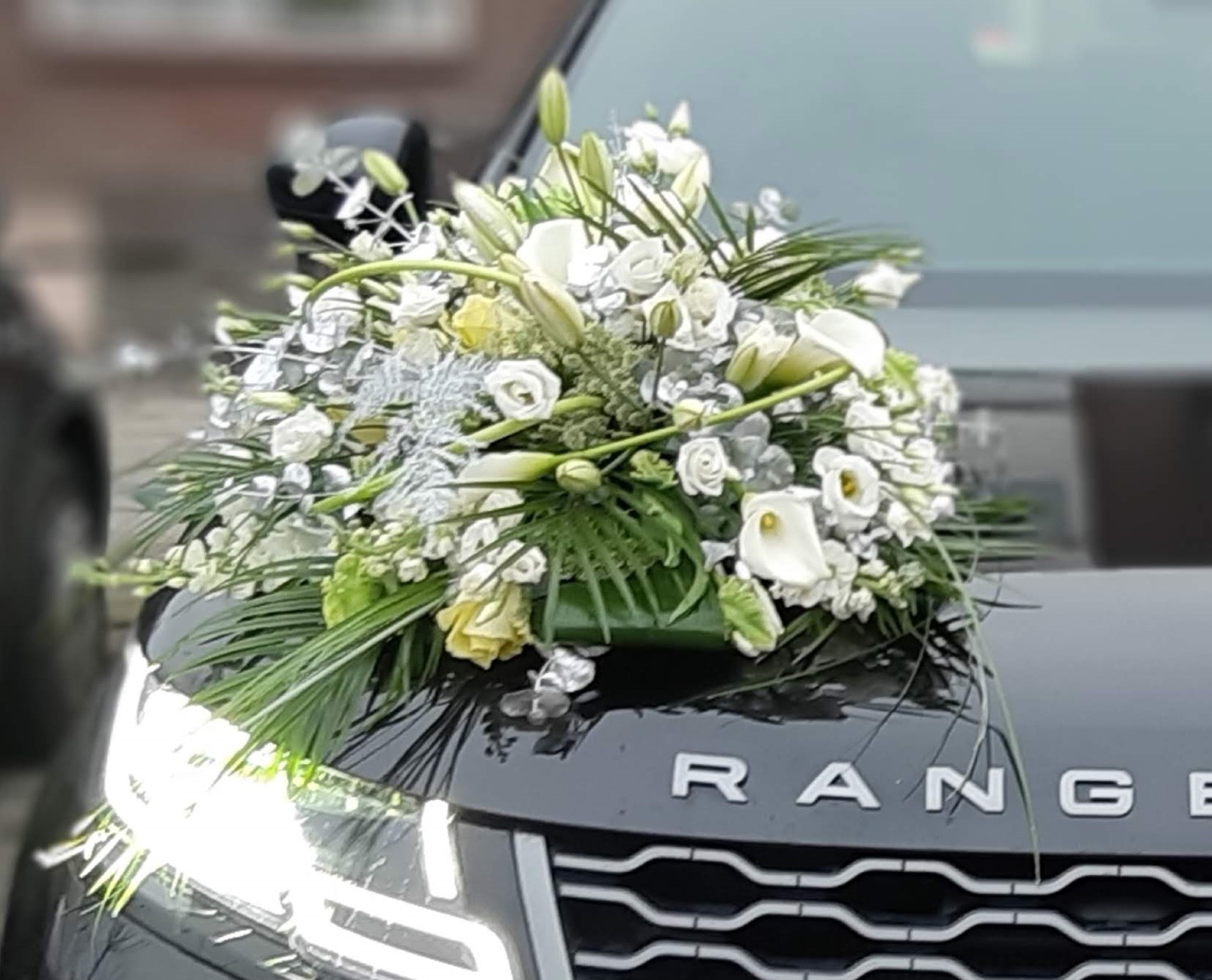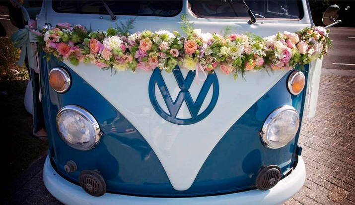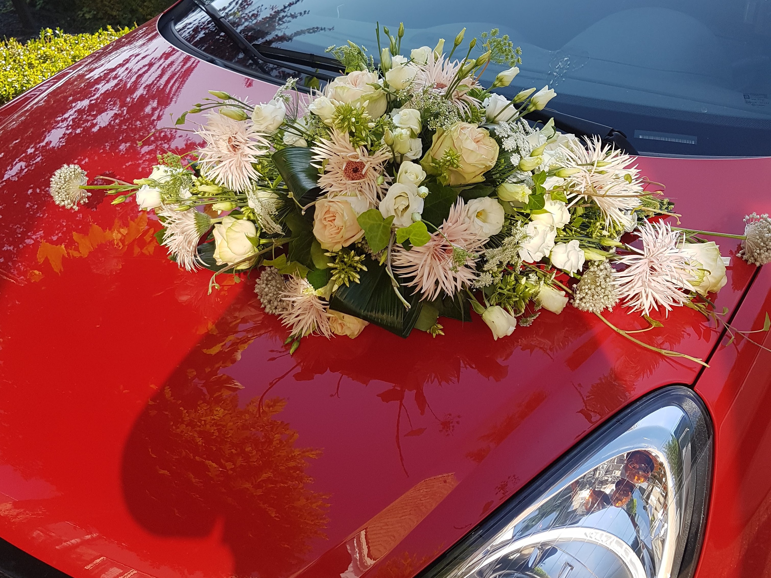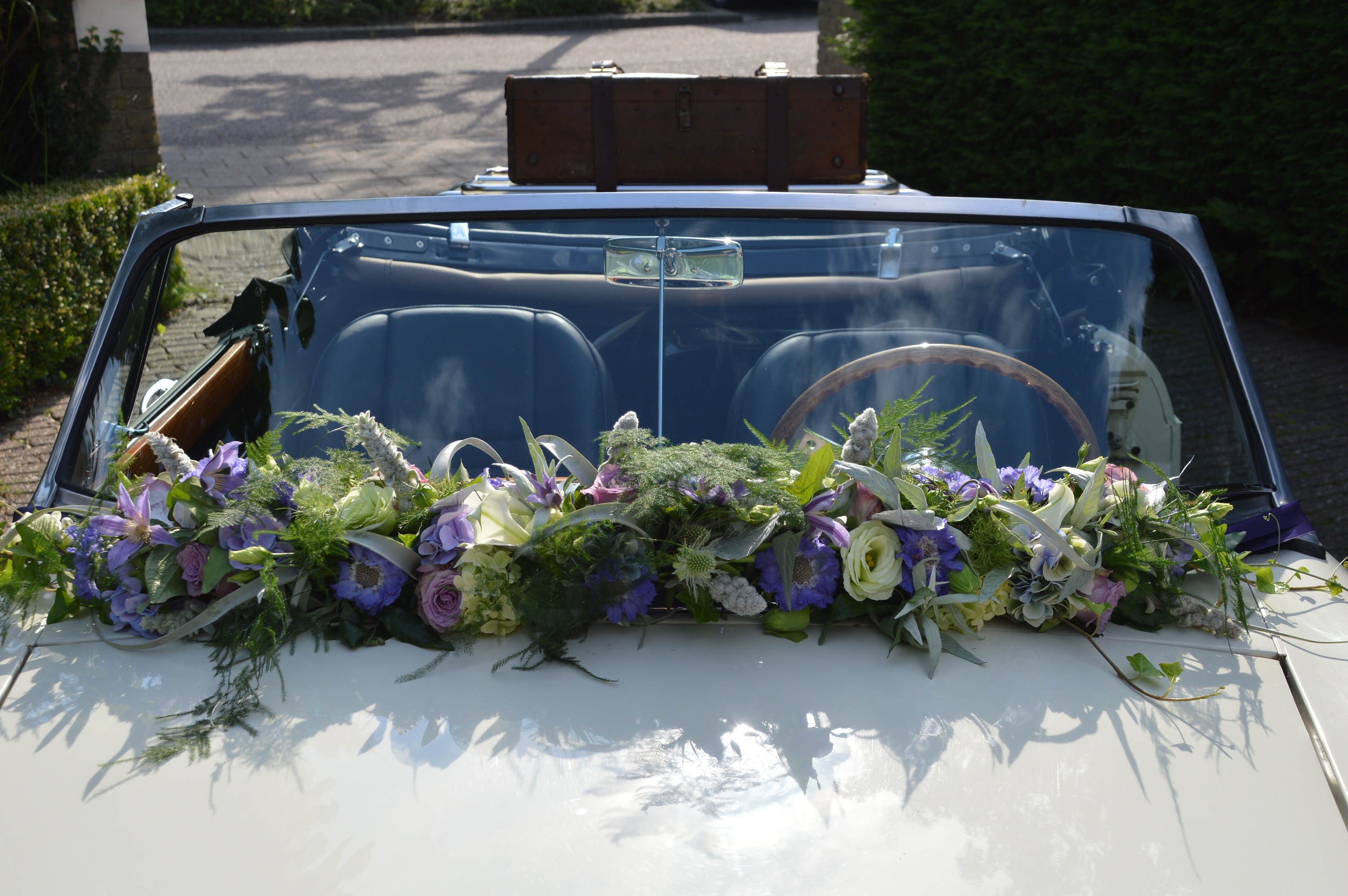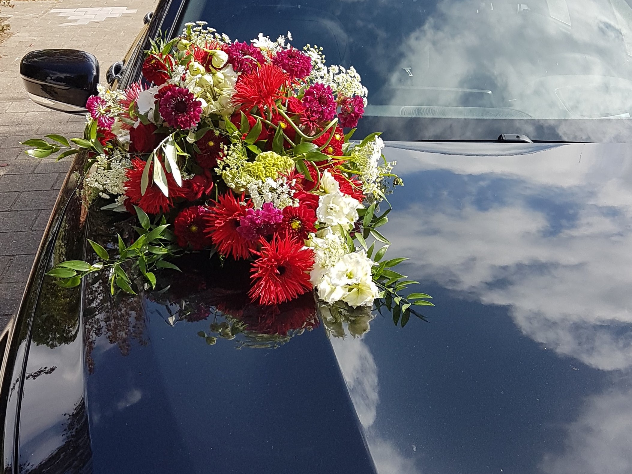 Do you have a chic or cool car available on your wedding day? With driver or perhaps to drive it yourself. Then I like to decorate it with matching flowers. Just a bit different than usual. The car gets more "wedding" appearance by attaching a small glass tube to the mirror with a bouquet. How about a garland in front of the window or across the hood.